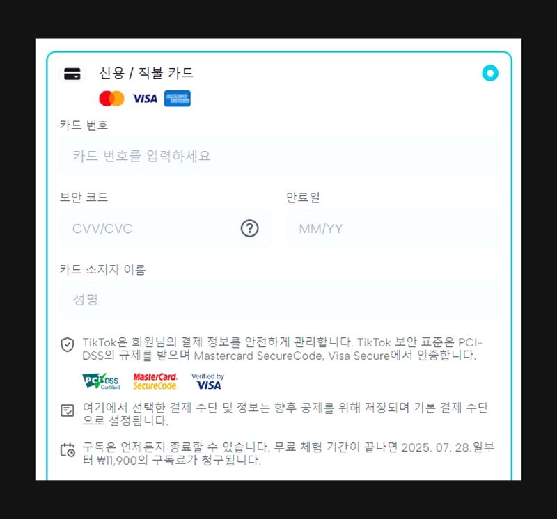 3단계: 카드 등록: 결제창에서 카드번호 입력 후 ‘무료체험’ 버튼 클릭.