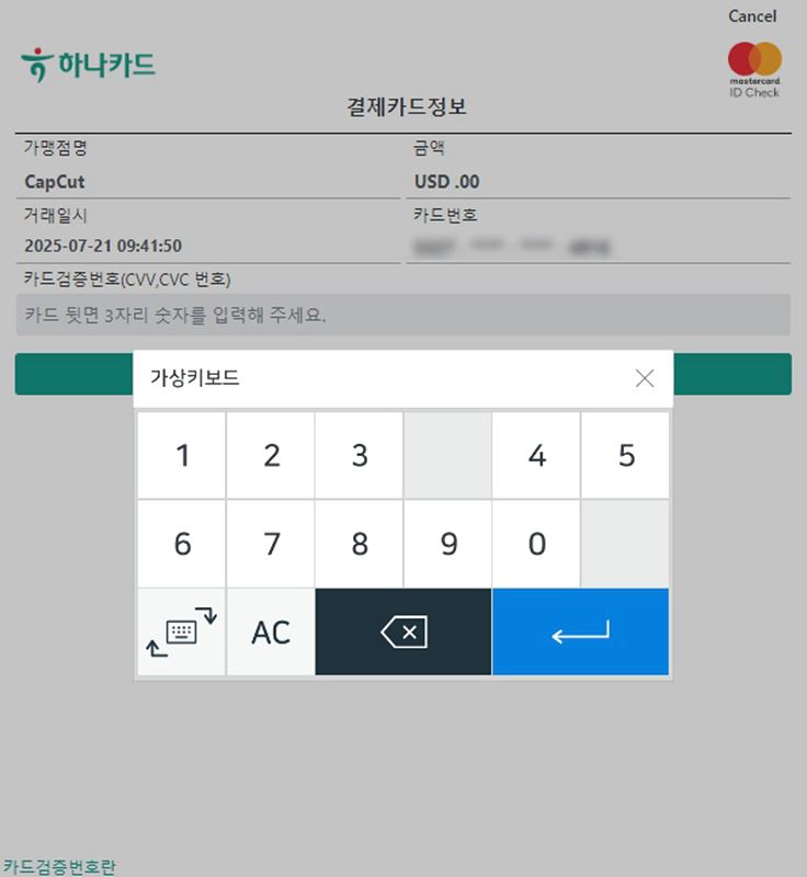 다음 단계에서 CVC 입력: 결제창에서 CVC 번호 추가 입력.