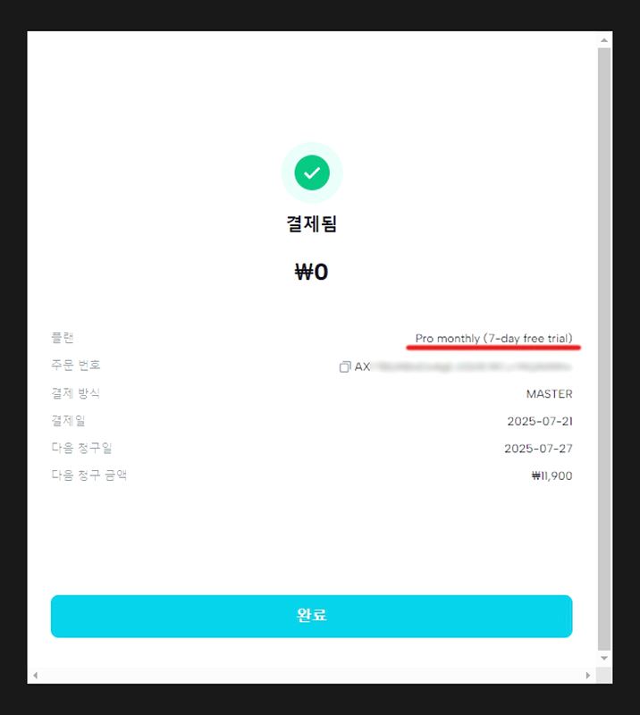 7단계: 결제 완료: ‘결제됨’ 페이지 확인, 즉시 Pro 기능 사용.