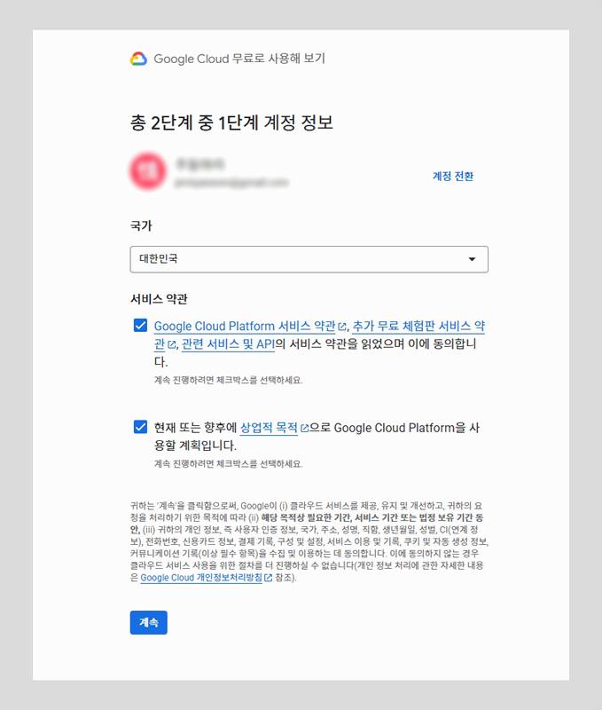아직 로그인하지 않았다면 구글 계정으로 로그인한 뒤 계정 정보를 입력하고 약관에 동의한 후 “계속” 버튼을 누릅니다.