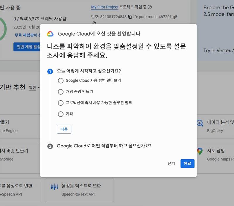 대시보드 상단에 “무료 체험판 사용 중”이라는 문구와 함께 300달러 크레딧이 자동 지급된 것을 확인할 수 있습니다. 이때 “일반 계정 활성화” 버튼은 절대 누르지 마세요. 이 버튼을 누르면 유료 플랜으로 전환될 수 있습니다. 실수로 눌렀더라도 크레딧을 모두 사용하기 전이라면 추가 요금이 청구되지 않으니 참고하세요.