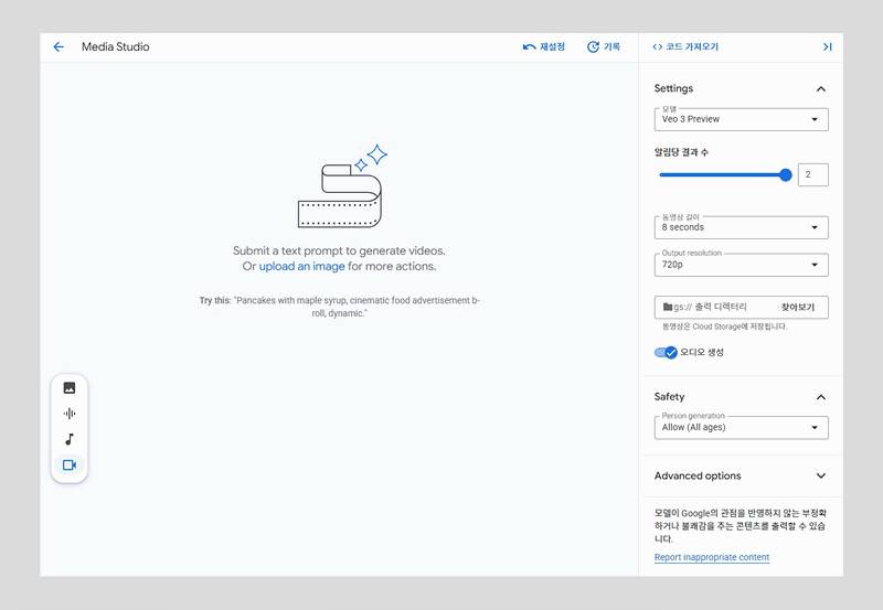 Media Studio 화면 중앙의 “Veo” 항목을 선택하면 영상 생성 인터페이스가 열립니다. 여기서 텍스트 프롬프트를 입력해 원하는 영상을 생성할 수 있습니다. 오른쪽 설정 패널에서는 생성 모델(예: Veo 3 Fast), 생성 수량(기본 2개), 동영상 길이, 오디오 생성 여부 등을 조정할 수 있습니다. 마음에 들지 않으면 반복 생성도 가능해요.